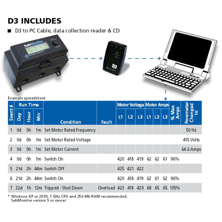 The D3-Data Download Device is a quick and simple unit to obtain recorded site data and note actions from the 3 phase Submonitor motor protection unit.